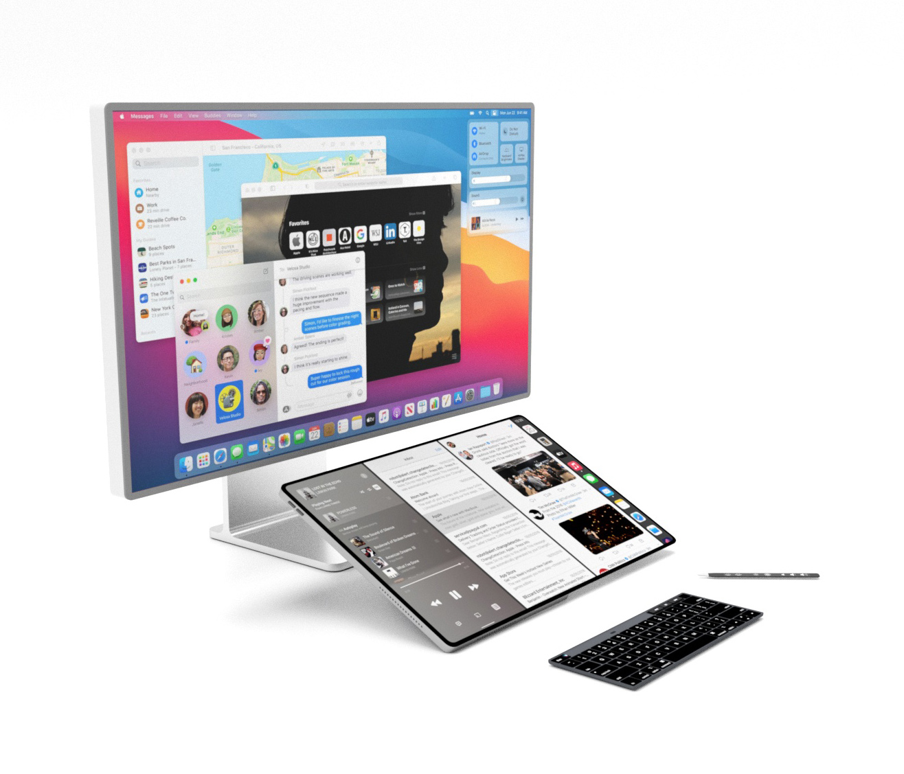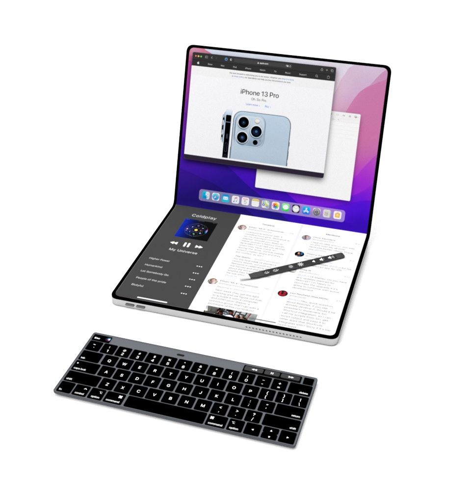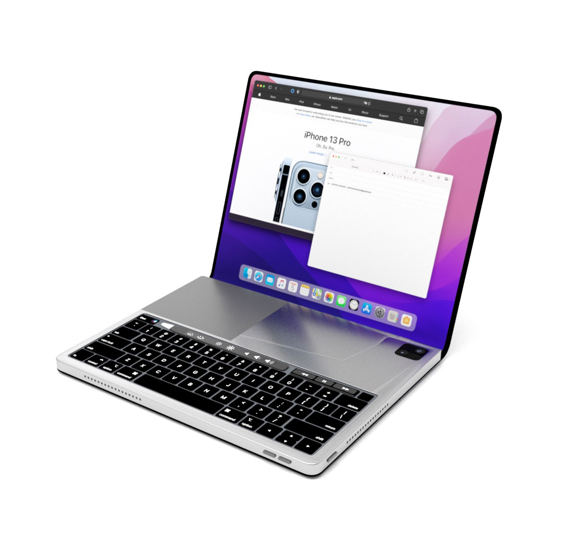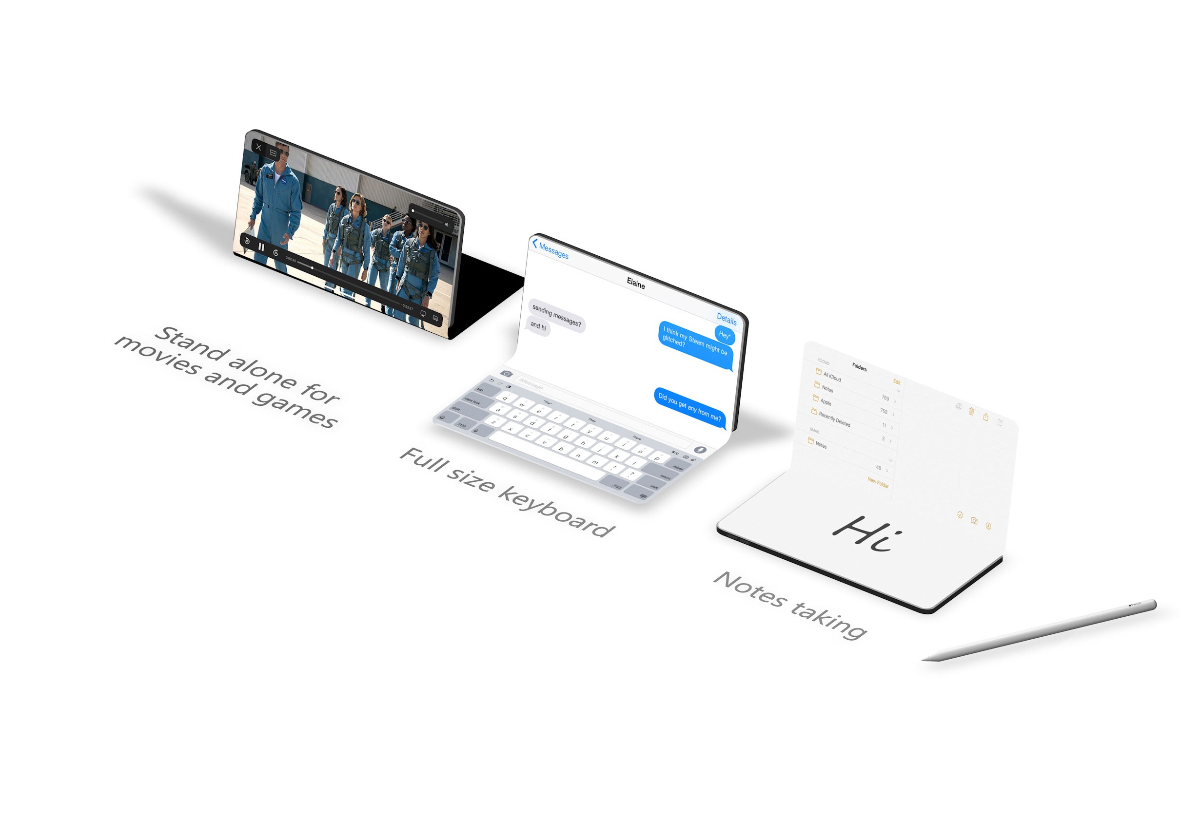 This is the first true foldable device. In this concept, only the screen is folding. This avoid to have a device that gets twice thicker when closed. The folding mechanism allows the iPhone to stand on its own (half folded), which is great for games and movies.